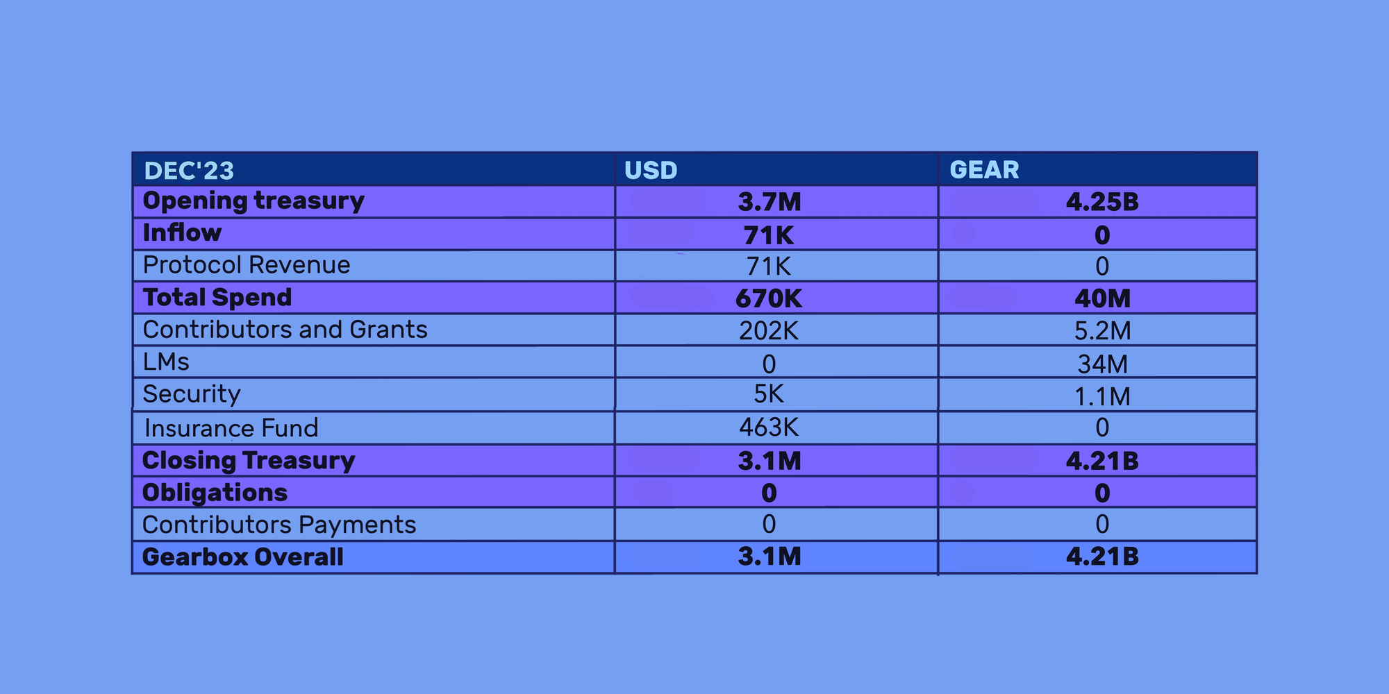 As of end of December, the DAO treasury holds $3.1M in non-GEAR dollar value in its address and an additional 4.21B GEAR Tokens. The realised revenue for the month was $71K while spends were at $670k. Contributor costs were at $79K(With January processed in December as well) while $123K were spent on grants further.