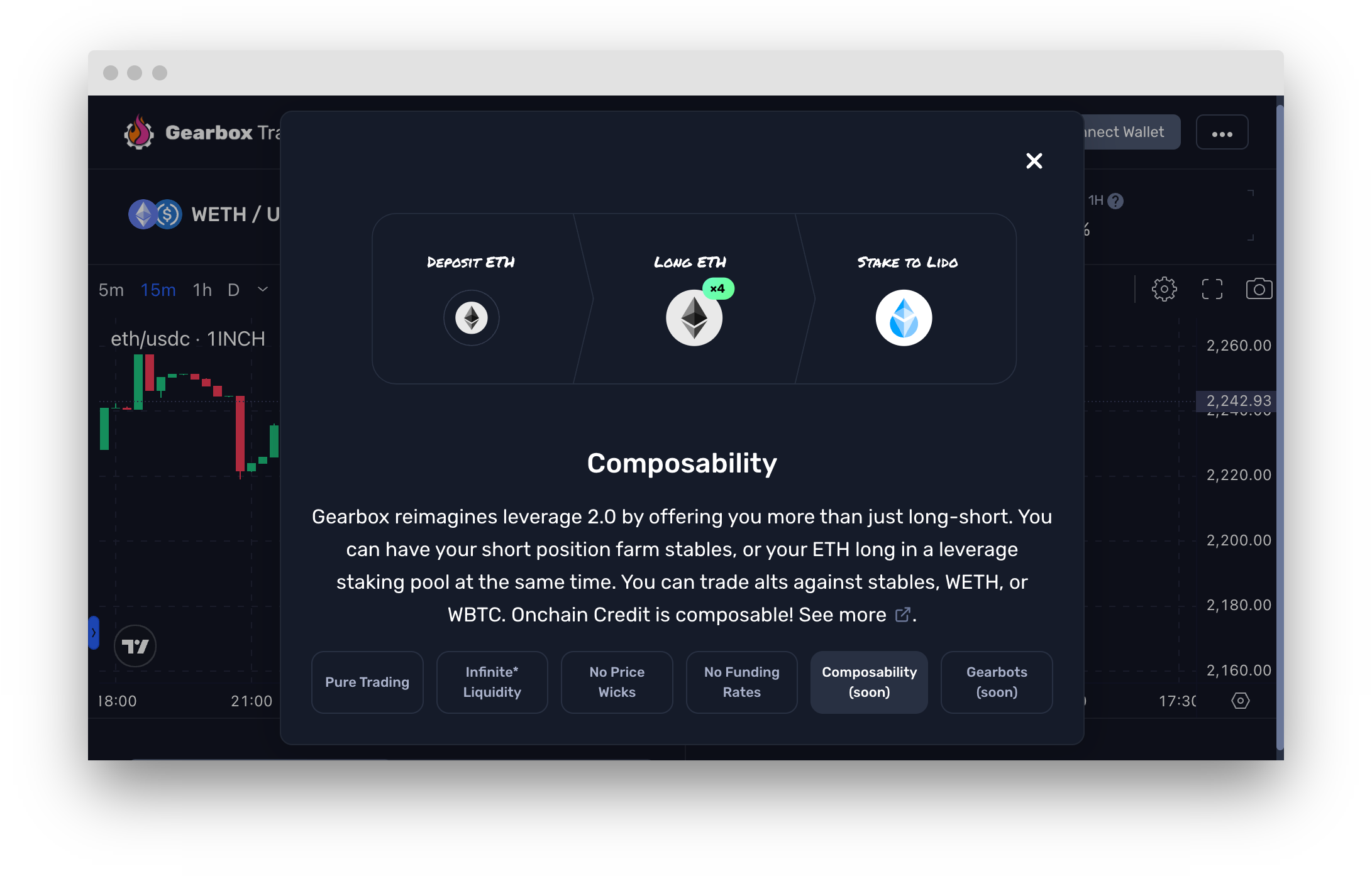 CEXes come with their own problems but when it comes to UI, they are the best in class. Gearbox's goal is to match up to those standards, a UI that feels instinctive to use and yet accommodates all the information required to trade is what we aim to provide.
