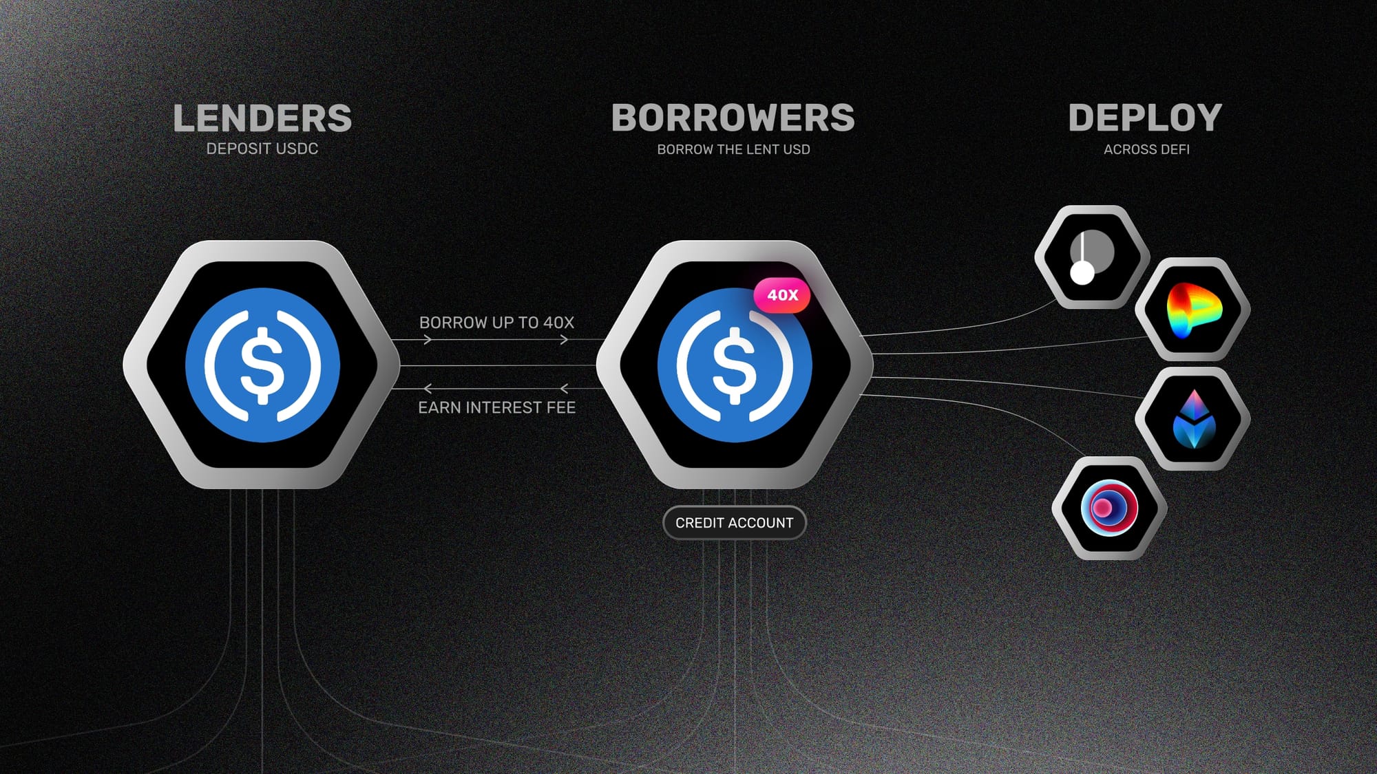 A Credit Account is similar to having a credit line for DeFi. It replaces the vending-machine like mechanism with a smart account-based system. Instead of depositing into a pool and borrowing from another, users can borrow up to 40X the collateral they deposit in their credit accounts and utilise it directly on external protocols.