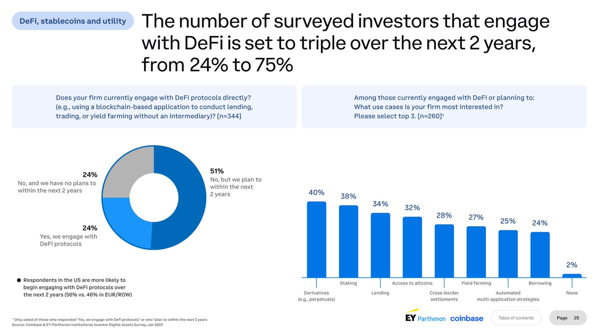 Institutions in DeFi aren't just allocating funds anymore, they are now active participants: as issuers, operators and policy makers. With and through the likes of @SuperstateInc, @Securitize, @MidasRWA and more, institutions are now working to bring TradFi structures onchain. The current participation, though, is just the beginning. A recent report by EY and Coinbase surveying 300+ institutions suggests